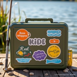 สติกเกอร์ติดกล่องอุปกรณ์ตกปลาแบบไดคัทสามารถกำหนดเองได้สติกเกอร์ติดกล่องอุปกรณ์ตกปลาที่ทนทานติดกลางแจ้งมีสไตล์เรียบง่ายตลกป้ายบรรจุภัณฑ์